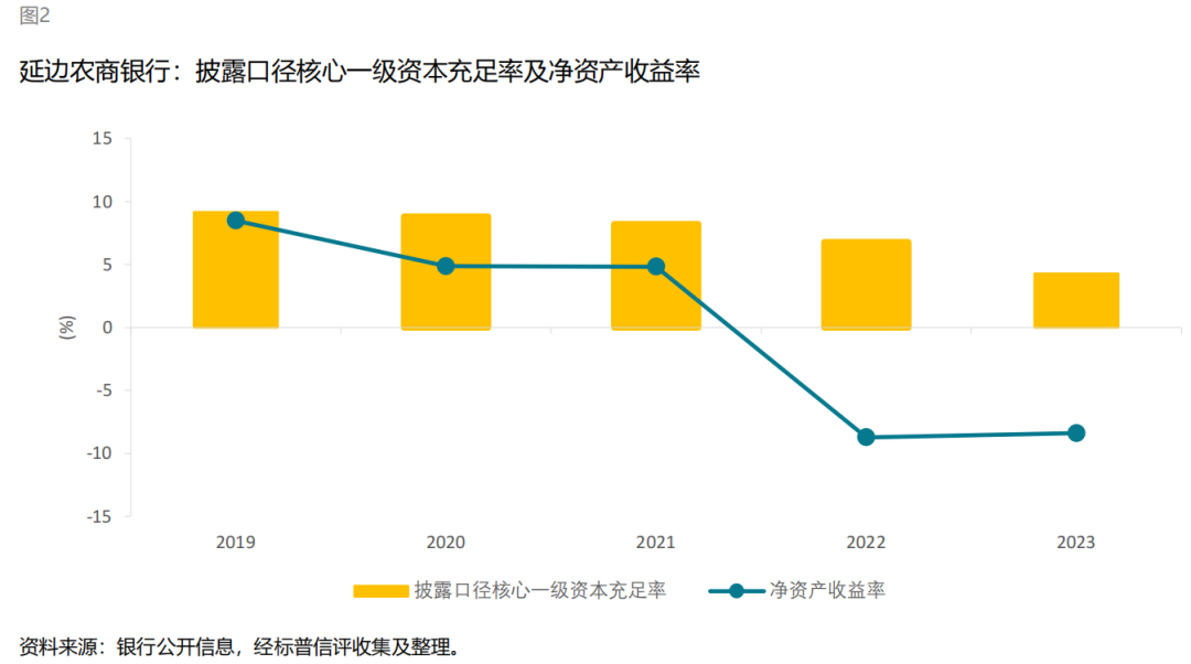 延边农商银行资本充足率已大幅低于监管要求,且盈利能力差,无法对资本进行有效补充。截至2023年末,该行披露口径的核心一级资本充足率、资本充足率分别为4.29%和6.33%,均低于监管最低要求。由于问题资产规模大,拨备覆盖水平低,我们认为该行在压力情景下的资本充足性水平会进一步大幅下降。