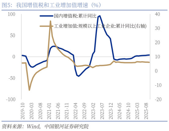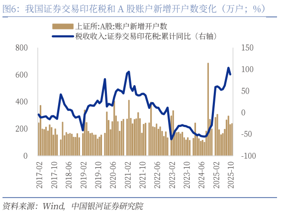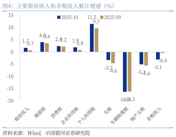 二是税收收入持续改善,主要税种普遍回升。1-10月一般公共预算收入同比增长0.8%,其中税收收入同比增长1.7%(前值0.7%),增速连续八个月修复。主要税种中,国内增值税、企业所得税、个人所得税、消费税1-10月累计同比分别增长4.0%、1.9%、11.5%、2.4%,均较前值有不同幅度改善。尤为突出的是印花税1-10月累计同比增长29.5%,其中证券交易印花税1-10月累计同比增长88.1%,对税收增长形成显著拉动。然而,与房地产相关的土地增值税和契税1-10月累计同比分别下降17.5%和14.7%,反映出房地产市场仍处调整期。非税收入1-10月累计同比下降3.1%,较9月降幅扩大。