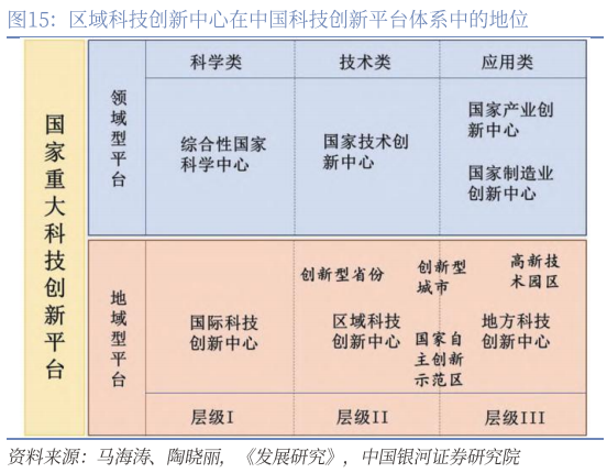 目前,我国国家级科技创新中心有两类,一类是国际科技创新中心,中央确定了北京、上海、粤港澳大湾区3家,另一类是区域科技创新中心,目前确定了成渝地区、西安、武汉3家。东部地区3个国际科技创新中心,中西部3个区域科技创新中心,共同构成了梯次联动、优势互补的“3+3”总体建设布局。对于三个区域科技创新中心,科技部都是围绕推动科技创新和产业创新深度融合、壮大战略科技力量、统筹推进教育科技人才一体改革、强化协同联动、营造开放创新环境等几个方面予以支持。具体而言,对于西安,“推动科技创新和产业创新深度融合”放在了第一位;成渝地区第一位是“强化协同联动,凝聚形成强大工作合力”;武汉第一位是“壮大战略科技力量,提升原始创新策源能力”。 这也对应着“十五五”规划建议稿中的完善区域创新体系,布局建设区域科技创新中心和产业科技创新高地,强化国际科技创新中心策源功能的要求。