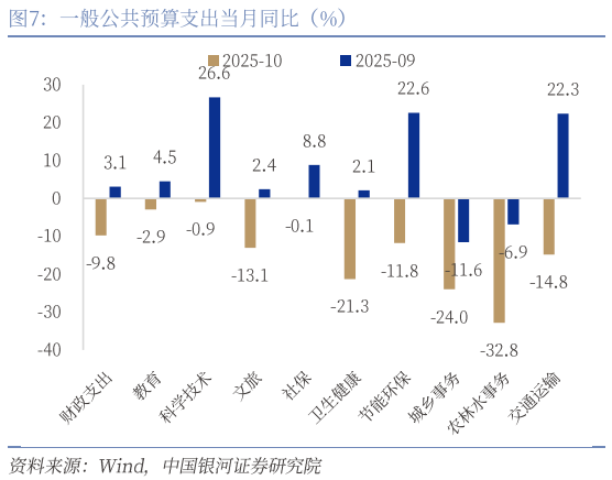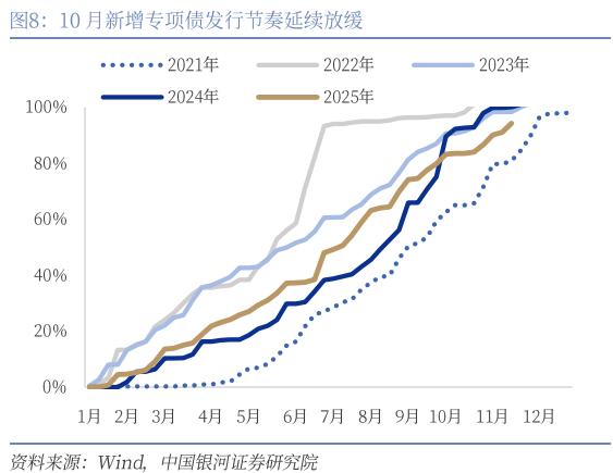 三是专项债发行放缓拖累二本账支出大幅下滑。一方面,基建增速降幅走阔,社保、科技和教育支出均有所放缓。1-10月一本账支出累计增速为2%(前值3.1%),当月同比增速转负降至-9.8%(前值3.1%)。支出结构方面,基建四项合计支出增速降至-6.6%(前值-4.5%),其中节能环保累计支出增速7%(前值8.8%),交通运输累计增速0.2%(前值1.8%),农林水事务累计增速-11.7%(前值-9%),城乡事务累计-7.3%(前值-5.8%),均有不同程度下滑;此外节能环保当月同比增速-11.8%(前值22.6%),农林水事务当月同比-32.8%(前值-6.9%),增速或受气候与资金向化债领域倾斜影响有关。另一方面,新增专项债发行节奏放缓拖累二本账支出增速大幅下滑。1-10月,全国发行新增地方政府专项债券3.96万亿元,发行进度达到90.1%,但低于去年同期9.8个百分点。发行节奏的放缓直接拖累了二本账支出增速,1-10月二本账累计支出增速为15.4%(前值23.9%),10月当月同比支出增速大幅放缓至-38.2%。