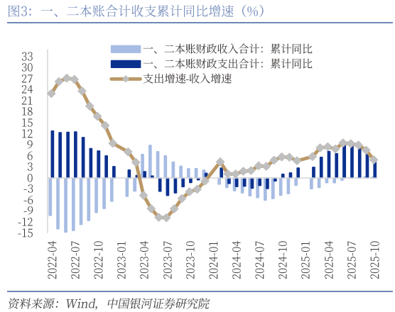 一是广义财政收入增速基本平稳,支出增速持续放缓。2025年1-10月,财政一、二本账合计收入增速小幅回落至0.2%(前值0.3%),合计支出增速降至5.2%(前值7.9%)。收入增速基本保持平稳,支出增速则连续三个月放缓,带动广义财政支出与收入增速差持续收窄。其中,一本账收入延续小幅改善态势,同比增长0.8%(前值0.5%),结构继续优化;二本账收入同比下降2.8%(前值-0.5%),降幅有所走阔。