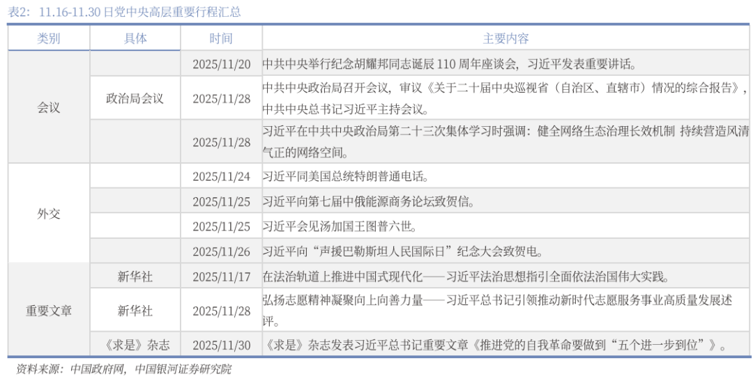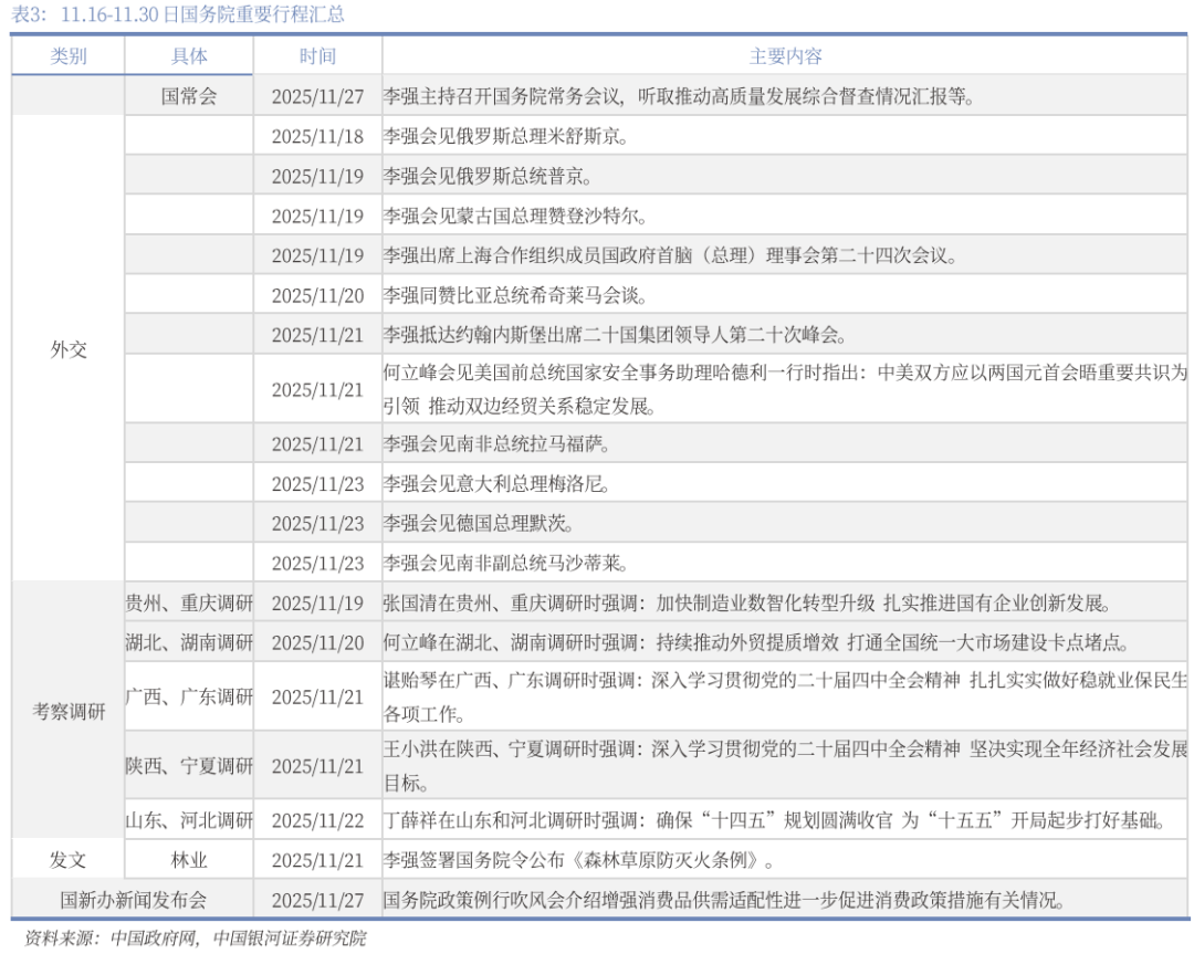 财政政策:1-10月财政数据公布。(1)2025年1-10月财政数据,整体来看,财政运行呈现“收入稳步改善、支出节奏调整”的特征。(2)财政部与中国人民银行于2025年11月印发《关于储蓄国债(电子式)纳入个人养老金产品范围有关事宜的通知》,明确自2026年6月起,将储蓄国债(电子式)正式纳入个人养老金产品范围。