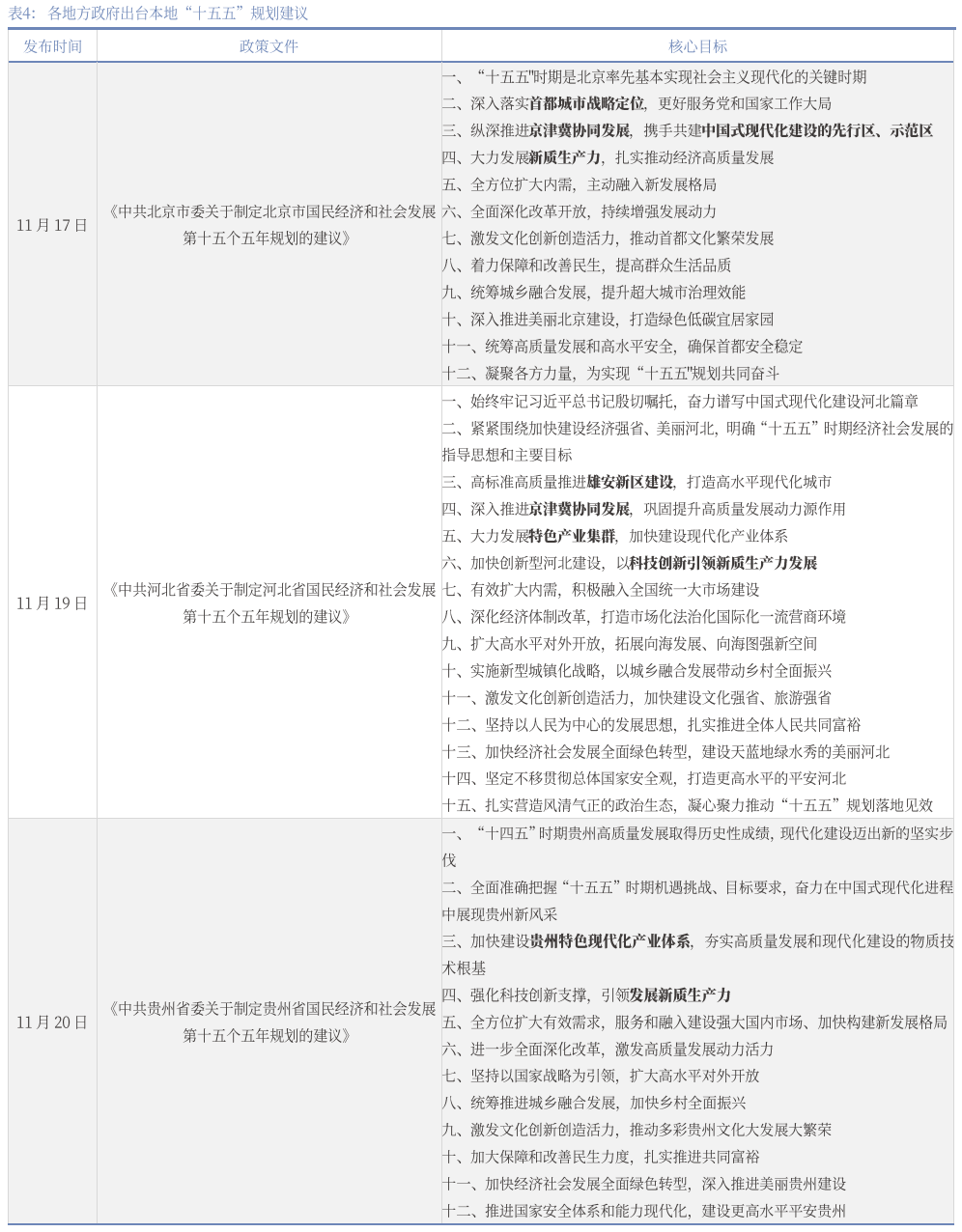 因地制宜落实国家重大发展战略、新质生产力落地生花是各地未来五年工作的重中之重。北京提出要落实首都城市战略定位,同时还要纵深推进京津冀协同发展,携手共建中国式现代化建设的先行区和示范区。河北提出高标准推进雄安新区建设、深入推进京津冀协同发展。推动科技创新和产业创新融合发展,因地制宜发展新质生产力也是“十五五”规划建议的另一重要工作。北京市要通过深化教育科技人才一体发展、建设中关村世界领先科技园区、打造全球数字经济标杆城市等重点工作大力发展新质生产力。河北提出要促进创新链产业链资金链人才链深度融合、加快创新湖北建设等举措建设现代化产业体系。贵州提出优化提升数智产业、新型综合能源、新能源新材料、优势矿产资源精深加工、酱香白酒、先进装备制造“六大产业集群”,发展壮大纺织服装、生态食品、健康医药“三大特色产业以构建贵州特色现代化产业体系。